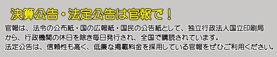 | も高く低廉な掲載料金を採用している官報をぜひご利用ください。 |